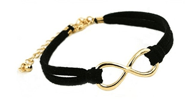 Spirituelles goldenes Infinity ‚Unendlichkeit‘ Armband / Armkettchen aus schwarzem Leder