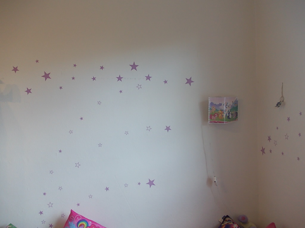 Bei unserer jüngsten wollten wir ein bisschen Farbe ins Kinderzimmer bringen und nach dem wir erst einmal kräftig ausgemistet haben habe ich mit einem Bleistift 3 Bögen auf die Wand gemalt. Auf diesen Bögen habe ich dann in verschiedenen Abständen die Sterne angebracht.