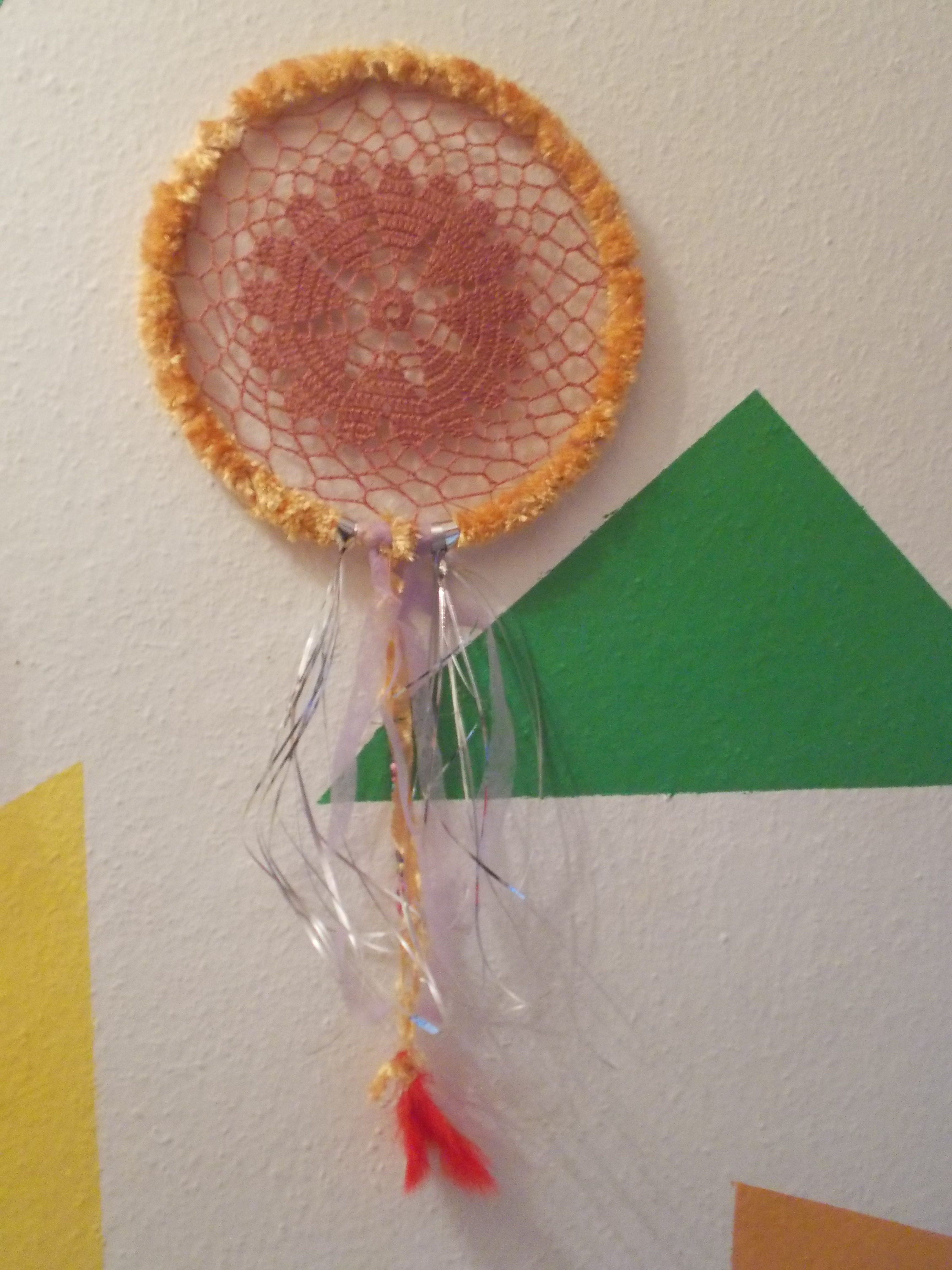 Das ist nun das fertige netz was bereits an den Rand genäht ist. Als Bänder habe ich genommen was gerade so zur Hand war. Ich hatte noch kleine Perlen da, diese habe ich aufgefädelt und dann noch ein paar Seiden und Glitzerbänder angebracht. Natürlich ist auch eines mit einer Feder dabei. Federn gehören ja nun einmal an jeden Traumfänger. 😉